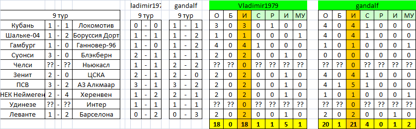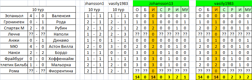№1: колпинский и B@y@85, которые добровольно самоустранились со второй половины Первенства в борьбе в ПЛ. Что мешает отправлять прогнозы на внешнюю почту или этой действо как-то спугнет удачу в дальнейшем – остается только догадываться.