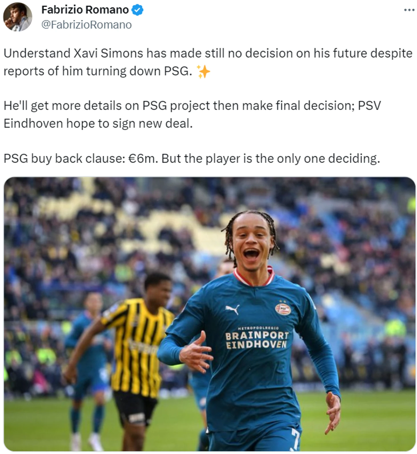 «Хави Симонс до сих пор не принял решения о своем будущем, несмотря на сообщения о том, что он отказался от перехода в «ПСЖ».