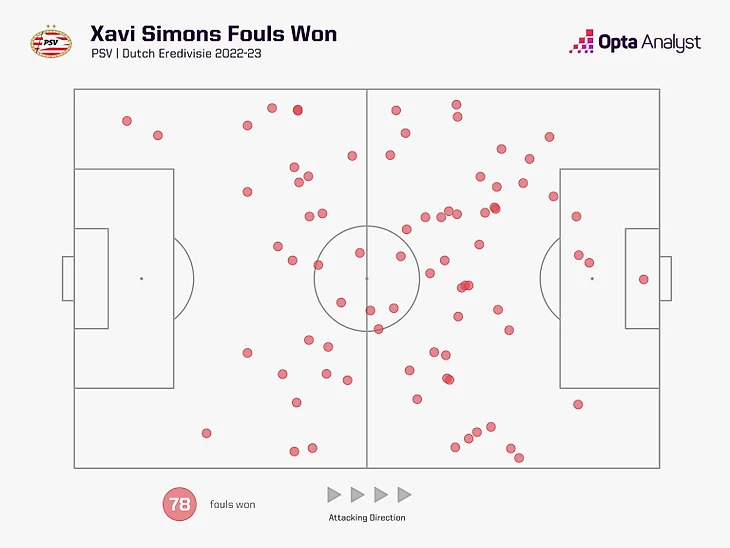Стоит также трактовать умение Симонса так эффективно продвигать мяч как способность обыграть соперника. Только Мохаммед Кудус (94) из «Аякса» совершил больше успешных обводок в Эредивизи в прошлом сезоне, чем Симонс (74). Часто у его оппонентов не было другого выбора, кроме как просто сбить Хави с ног – именно поэтому у вингера четвёртый показатель в лиге по количеству заработанных фолов (78), 25 из которых пришлись на финальную треть поля. А после 19 из этих 78 фолов соперник получал карточку – лучший показатель среди всех игроков лиги в сезоне со времен Ирвинга Лозано сезона 2018/19: тогда после фолов на игроке «ПСВ» 23 раза арбитр показывал карточку.
