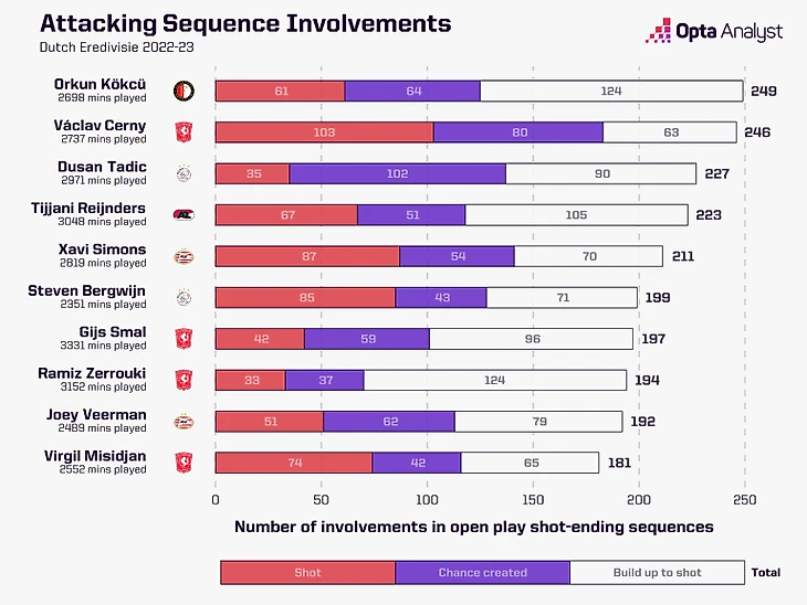 И пусть до сезона 2022/23 у игрока не было ни одного года со значительным количеством минут на поле, «ПСВ» всё же решился довериться молодому таланту и не прогадал. Хави Симонс занял пятое место среди всех игроков Эредивизи по общему количеству участий в комбинациях, завершившихся ударом по воротам с игры (211) – больше, чем у любого другого игрока команды.
