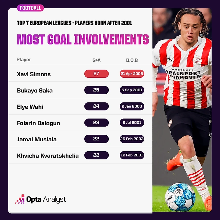 Не стоит забывать, что Симонс, помимо забитых голов, отдал ещё 8 голевых передач, в результате чего общее количество голевых действий в лиге достигло цифры 27. По итогам сезона 2022/23 он стал самым молодым игроком с таким количеством голевых действий в топ-7 европейских лигах.