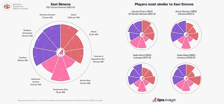 Когда мы сравниваем все его показатели и игровые качества с данными других игроков топ-5 европейских лиг за последние 15 лет, перед нами формируется профиль Симонса: показатели голландца не уступают цифрам топ-футболистов.