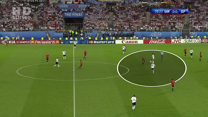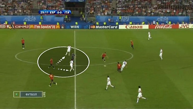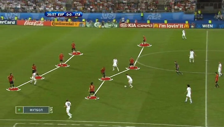 Полузащита давала Испании количественное (там всегда было 4-5 футболистов) и качественное преимущество (не теряли мяч под давлением за счет техники). Эта система позволила Хави стать MVP турнира. Его роль была основополагающей.
