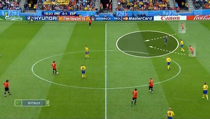 Этот прием был особенно уместен, когда соперника ловят на разрыве (часть команды вернулась, а 4-5 футболистов не успели – нормальная ситуация для футбола того времени). Испания всегда насыщала атаку на скорости нужным количеством игроков и мощно импровизировала.