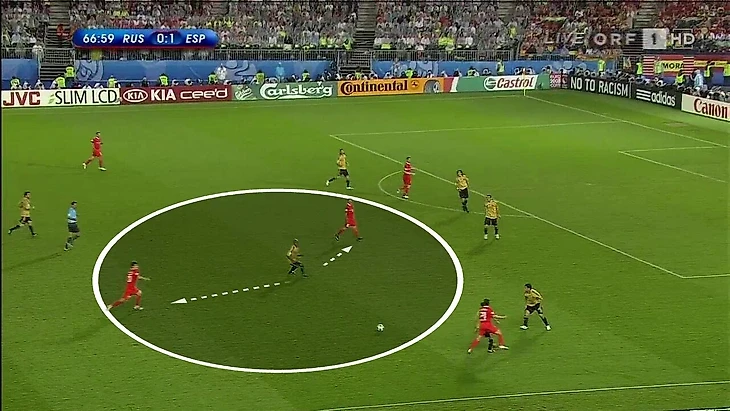 Примером контроля в центре и рожденной таким футболом комбинации стал гол Хави в ворота России в полуфинале – здесь и постоянная смена позиций в центральной зоне, и уверенность технарей под давлением, и головокружение у оппонентов, и участие полузащитников в завершающей стадии: