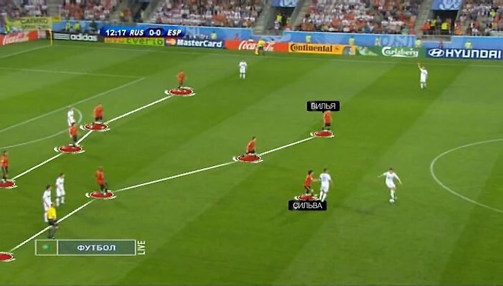 Для успешности в таком рисунке важна была надежность в этой стадии. Арагонес везде здорово организовывал оборону. Команда весьма быстро садилась в нужную схему. Отдельно нужно отметить роль Давида Вильи. Лишь формально он был в паре с Торресом. Реально отрабатывал по опорнику соперника: