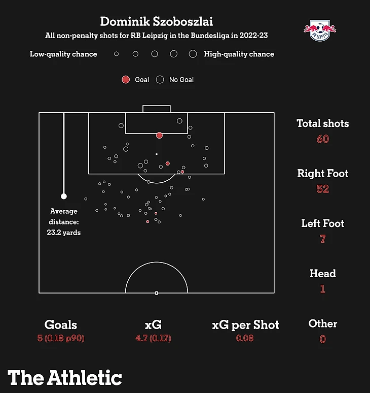 Все верно, цифры подтверждают то, что видели ваши глаза: только Лерой Сане из мюнхенской «Баварии» нанес больше ударов из-за пределов штрафной, чем Собослаи в сезоне Бундеслиги 2022/23.