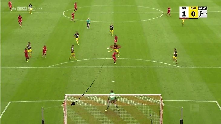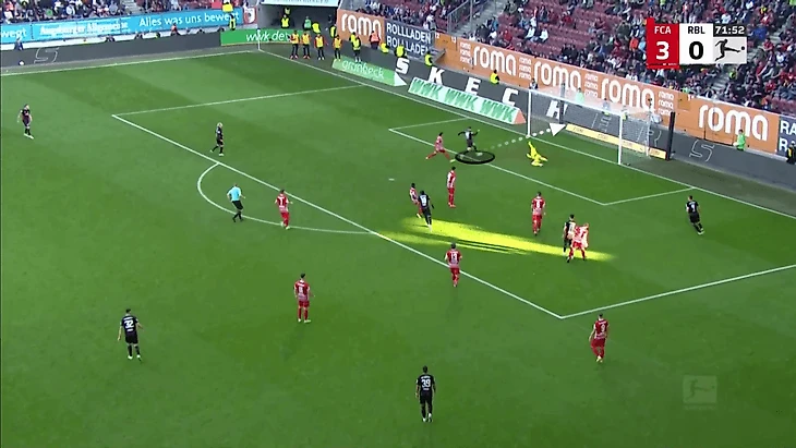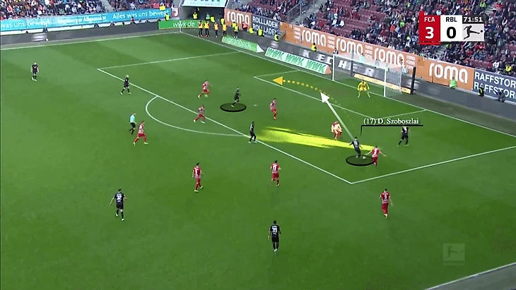 Возьмем этот пример против «Аугсбурга». Когда Собослаи выходит на мяч, партнер по команде Андре Силва оказывается на дальней штанге. С двумя защитниками между ним и мячом пас черпачком может показаться лучшим вариантом (желтая пунктирная линия), но вместо этого Собослаи предпочитает разыграть мяч через газон (белая линия) на пространство...