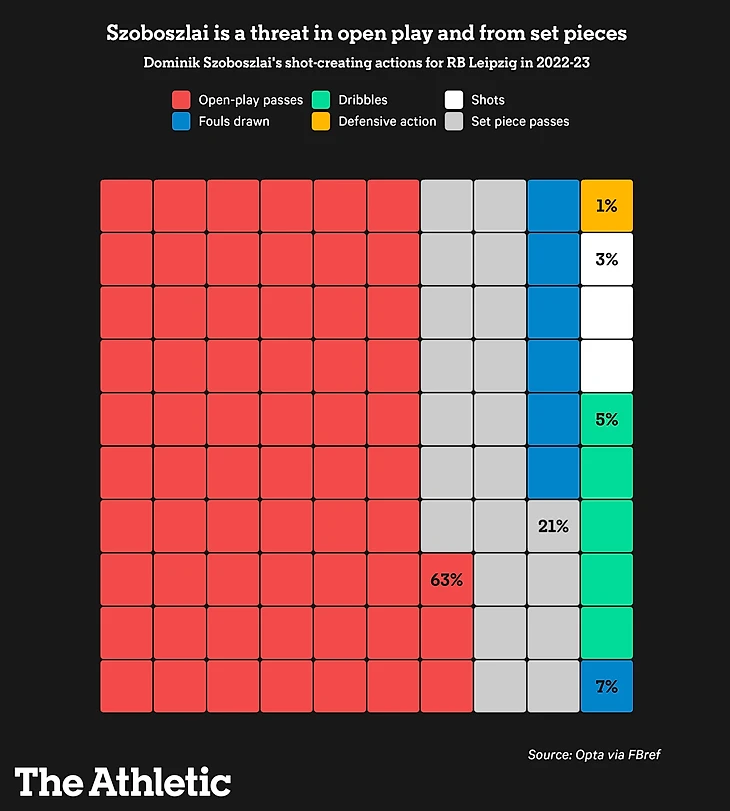 В целом, 2,6 момента, созданных венгром за 90 минут, стал девятым по величине среди всех игроков Бундеслиги в прошлом сезоне. Можно было бы предположить, что здоровый объем этого творчества будет несправедливо дополнен стандартами, но 1,7 созданных Собослаи моментов в начале игры за 90 минут по-прежнему были одними из лучших в Германии — достаточно хорошими для 11-го места в лиге.