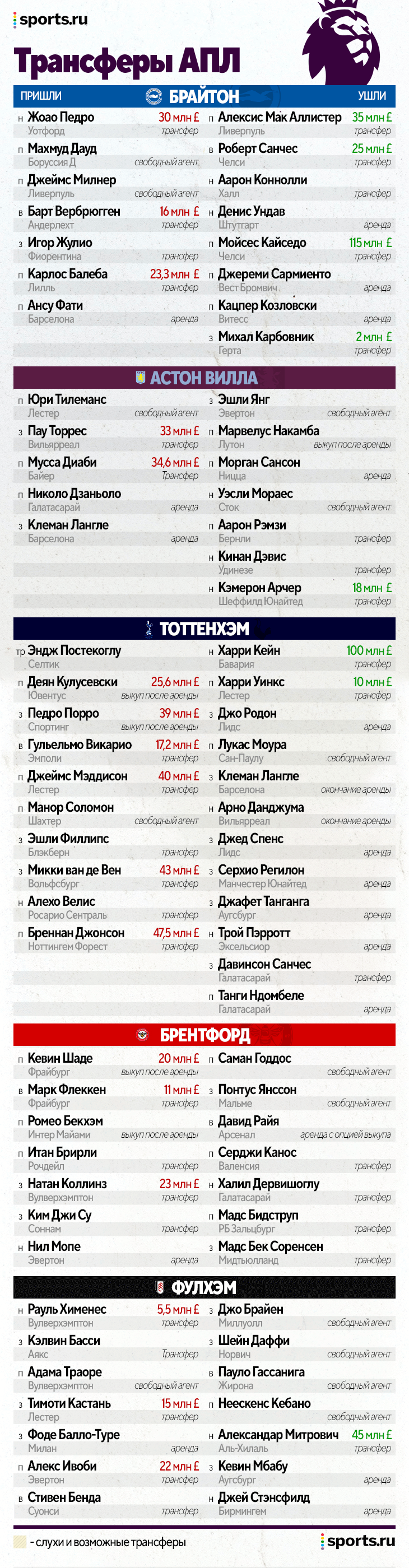 ● Всего клубы потратили 2,44 млрд фунтов – это новый рекорд. Побит показатель прошлого лета в 2,14 млрд.