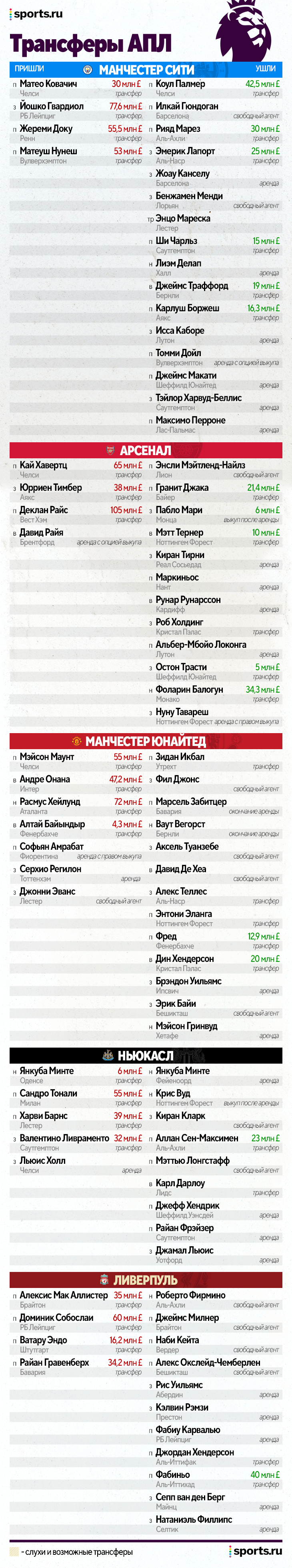 Все летние трансферы АПЛ: 115 млн за Кайседо, Райс в «Арсенале», новый вратарь «МЮ»