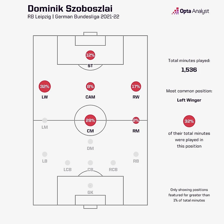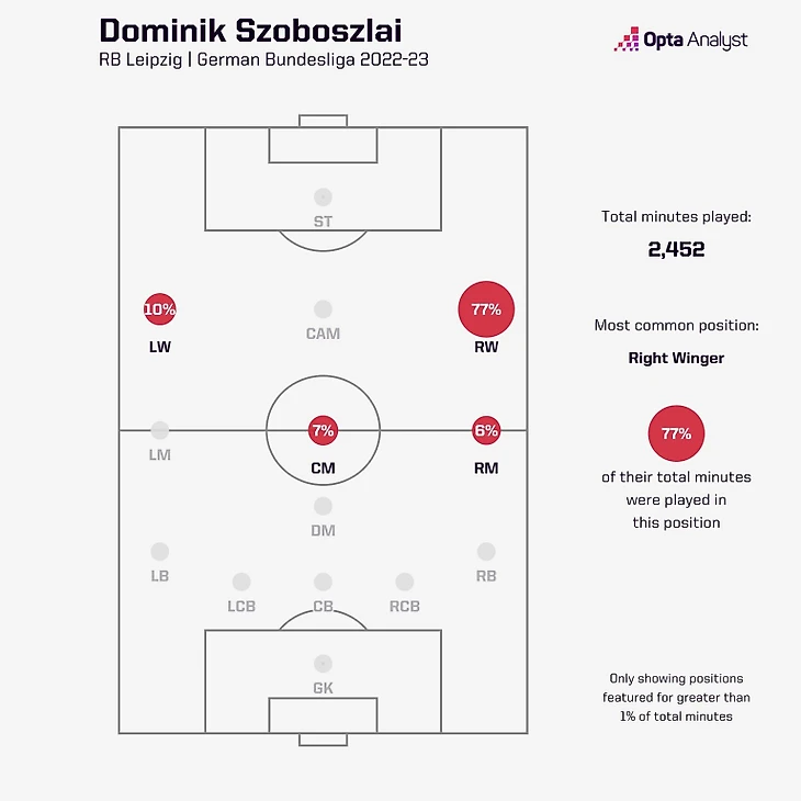 В прошлом сезоне Собослаи нашел более стабильную позицию в составе "РБ Лейпциг": 77% своего игрового времени он провел на позиции правого вингера. Это был сдвиг по сравнению с сезоном 2021-22, когда он играл в основном на позиции левого вингера (потенциально, чтобы использовать свои фантастические качества удара по мячу, позволяющие ему пробивать с правой ноги) и центрального полузащитника - эти две позиции составили 60% его игровых минут в Бундеслиге, и только 17% - на позиции правого вингера. Его способность играть в центре поля - очевидная привлекательная черта для любого потенциального клуба.