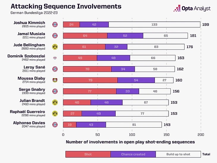 Интересно также отметить, что Собослаи возглавил чарты Бундеслиги сезона 2022-23 по количеству вовлечений (участие как в подготовке, так и в самом ударе или создании шанса для удара) в открытой игре. Он участвовал в 29 таких эпизодах (15 ударов, 14 созданных моментов), что на четыре больше, чем у следующего по этому показателю Сержа Гнабри из "Баварии" (25). Благодаря быстрым ногам, он также нанес семь ударов, которые последовали за одним-двумя с товарищем по команде - больше было только у четырех игроков, причем трое из них в "Баварии" (Гнабри, Лерой Сане и Джамал Мусиала).