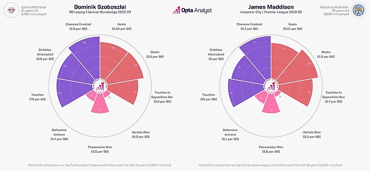 В прошлом сезоне у венгра был самый близкий показатель сходства с Джеймсом Мэддисоном в "Лестер Сити" в сезоне 2019-20 (94% сходства) - это всего лишь второй сезон на высшем футбольном уровне, который провел игрок сборной Англии, и в котором он вошел в пятерку лучших игроков по количеству ударов в Премьер-лиге (всего 153). По этому показателю он уступал только Кевину Де Брюйне, Мохамеду Салаху, Раулю Хименесу и Джеку Грилишу. По сути, Мэддисон был креативной силой, которая часто наносила удары по воротам соперника.