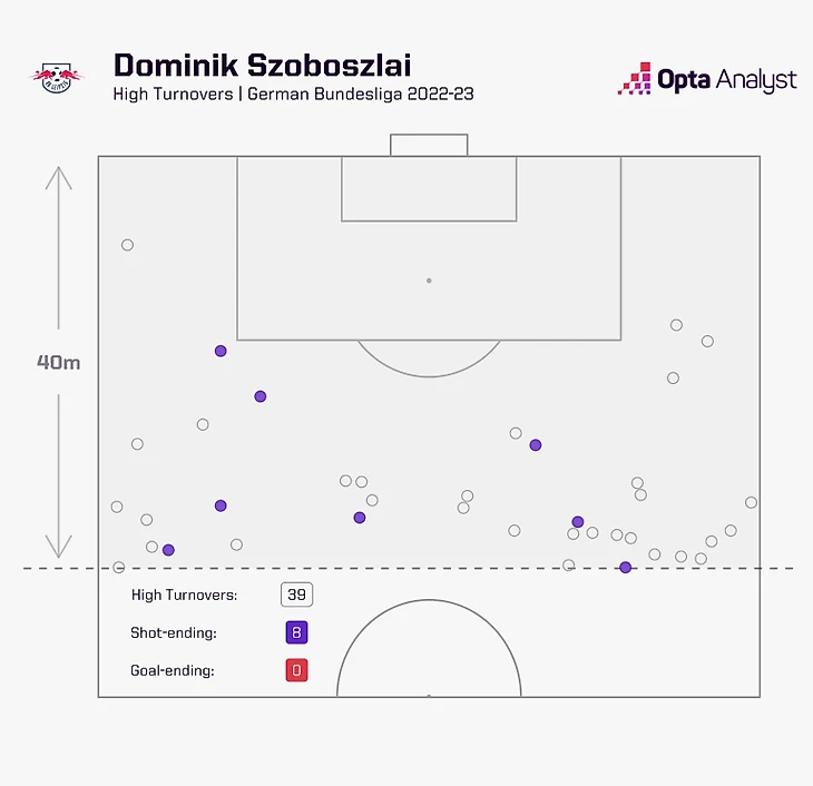 Собослаи сыграл важную роль в возвращении владения мячом в пределах 40 метров от ворот соперника, овладев в общей сложности мячом после прессинга (39) - больше всех игроков "Лейпцига" и шестой показатель во всей лиге. Только три игрока больше раз овладевали мячом после прессинга, которые привели к ударам, чем Собослаи (8), и полузащитник снова стал лидером своего клуба. В целом, только Киммих из "Баварии" (53) в сезоне 2022-23 начал больше эпизодов открытой игры, которые в конечном итоге привели к удару, чем Собослаи из "РБ Лейпциг" (37).