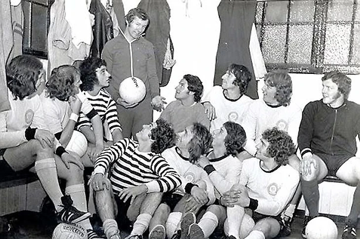 1974 год, раздевалка на Фирс Парк, главный тренер Ист-Стирлингшира Алекс Фергюсон и футболисты команды. Незадолго до окончания карьеры Алекс Фергюсон играл за Фолкерк, но тренировать свой бывший клуб после окончания карьеры футболиста ему не сложилось, недолго в 1974 году, в будущем прославленный на весь мир шотландец, возглавлял соседей. С Ист-Стирлингширом ничего выиграть не удалось, но это был первый кирпичик в легендарной тренерской карьере.