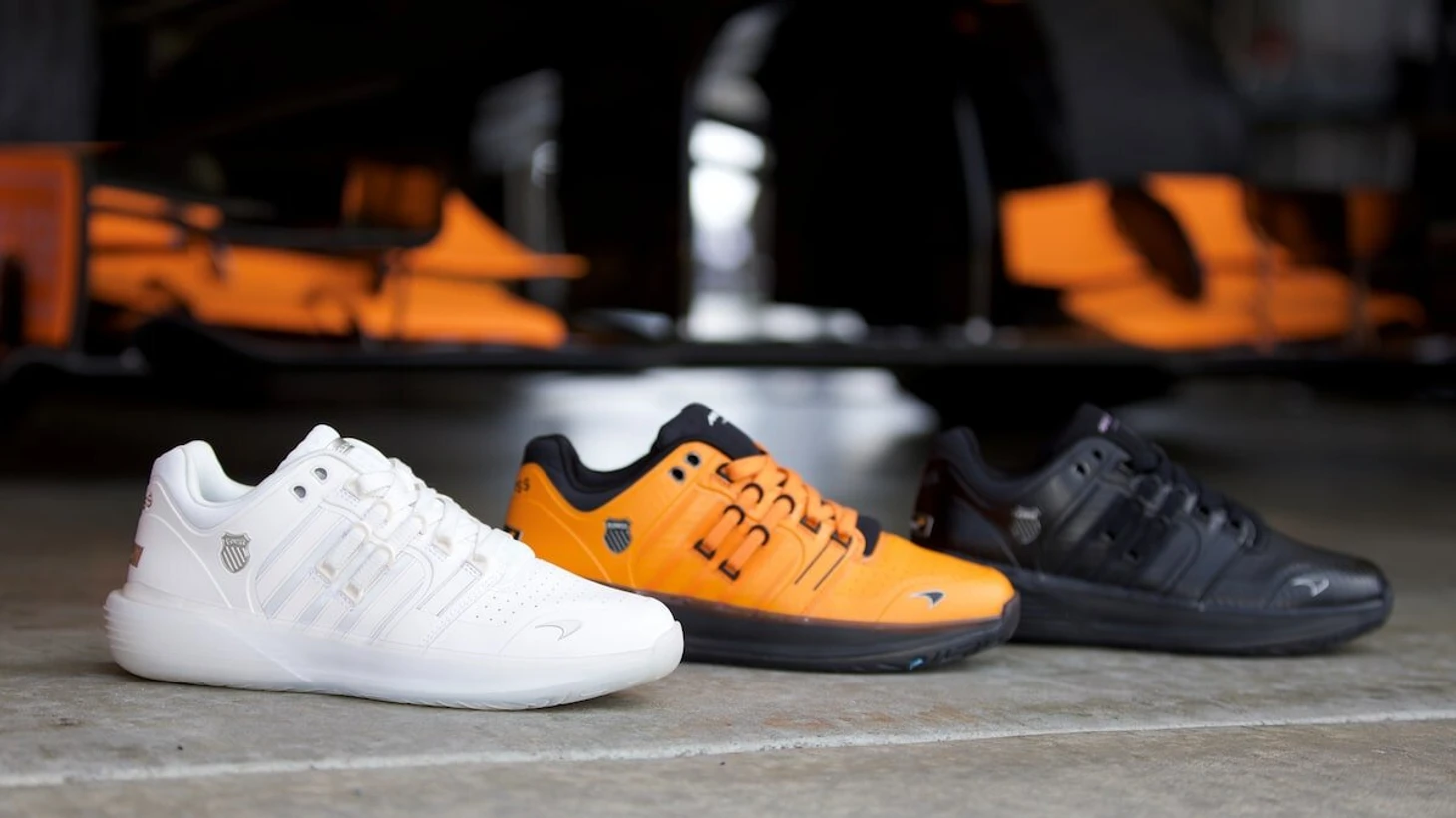 В начале 2023 года K-Swiss объявили о долгосрочном глобальном партнерстве с McLaren – бренды-ровесники из 60-х выпустили совместную коллекцию, кроссовки и шлепанцы из которой будут носить пилоты и инженеры команды на гоночных мероприятиях по всему миру. Потребительский вариант коллекции еще шире – и доступен уже сейчас.