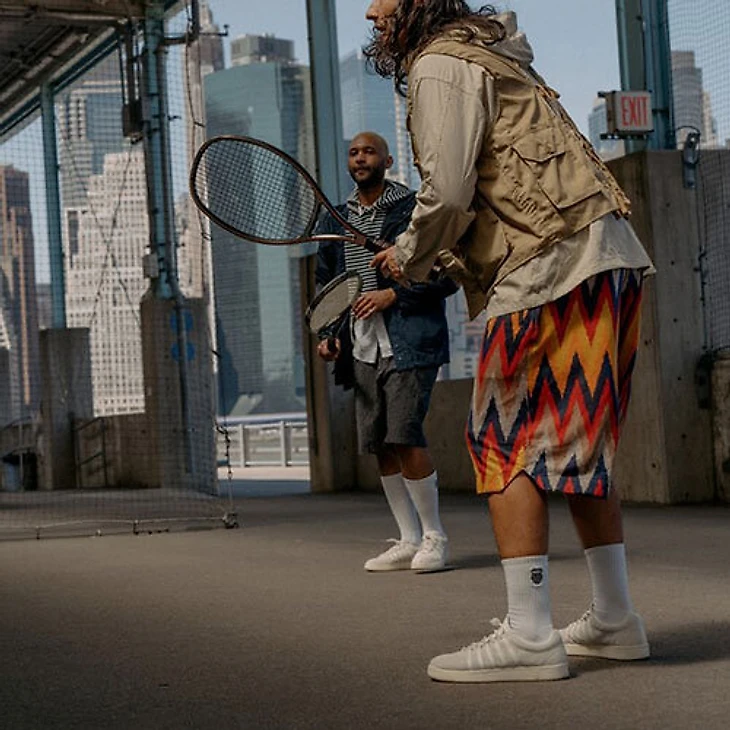 В духе возвращения к истокам K-Swiss за последние годы подписали несколько профессиональных теннисистов: семикратную чемпионку «Больших шлемов» Винус Уильямс, а также игроков топ-15 Кэмерона Норри и Людмилу Самсонову. В прошлом году компания выпустила совместную коллекцию с Rowing Blazers – другим американским брендом с культурным каше (его прославила принцесса Диана). В 2023-м коллаборации K-Swiss c нью-йоркскими брендами Corridor и Engineered Garments были представлены соответственно съемками для эстетского теннисного журнала The Racquet и у культового манхэттенского книжного магазина Strand.