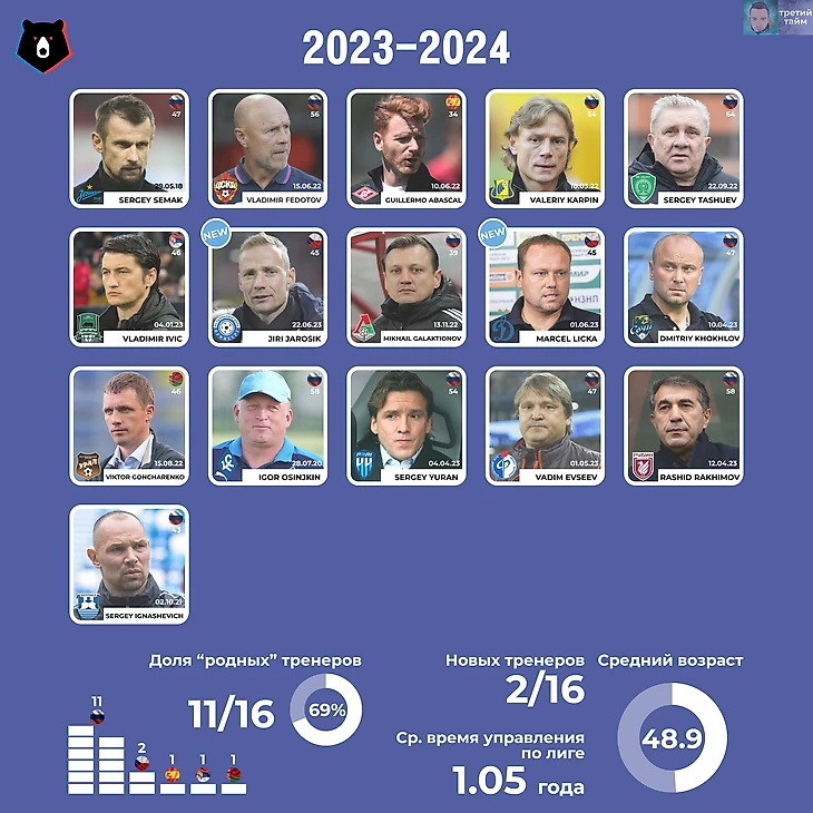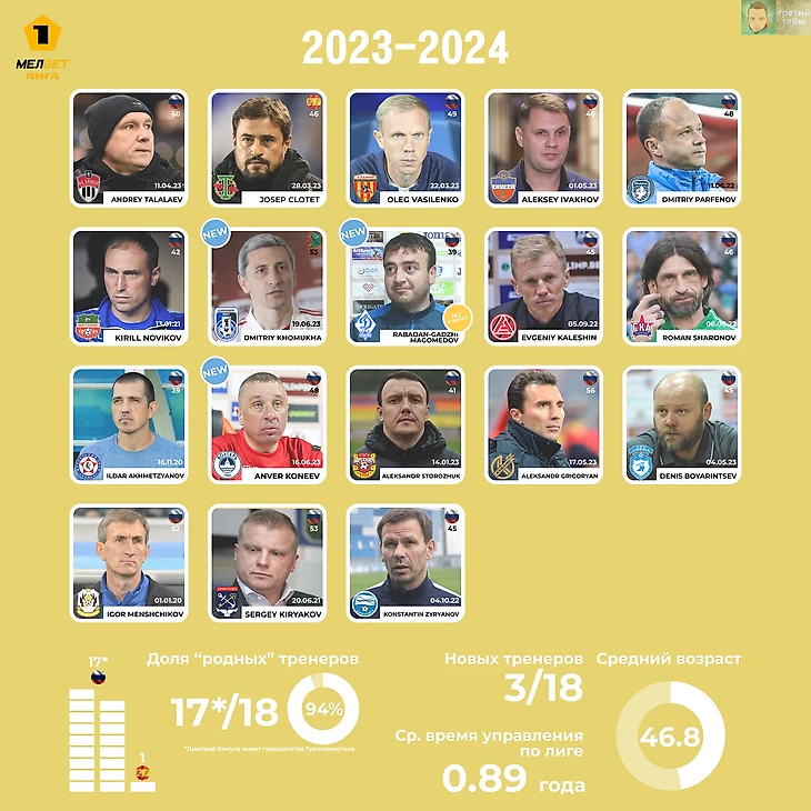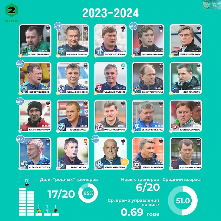 Что еще? Средний возраст тренеров в ФНЛ еще ниже, чем в РПЛ и составляет 47 лет, а средний показатель нахождения на тренерском посту в менее года, отчего можно смело предположить, что ждать первых отставок долго не придется и в этом сезоне.