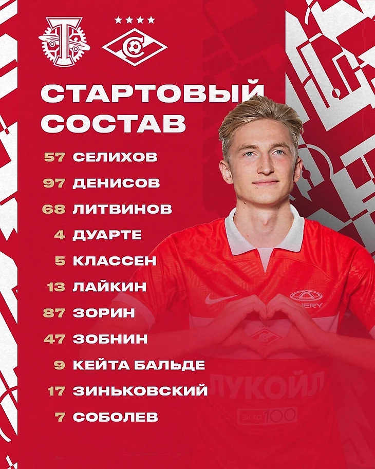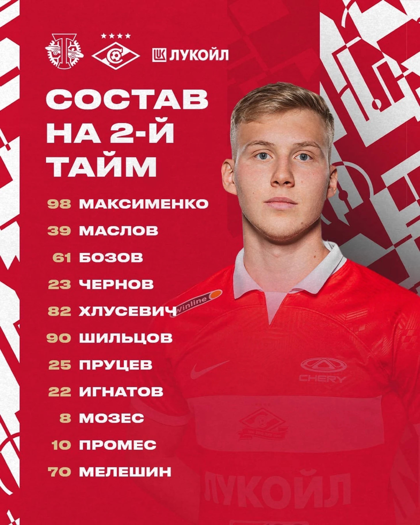 Первый тайм: Селихов (Максименко, 30), Денисов, Литвинов, Дуарте, Классен, Зорин, Лайкин, Зобнин, Зиньковский, Бальде, Соболев.