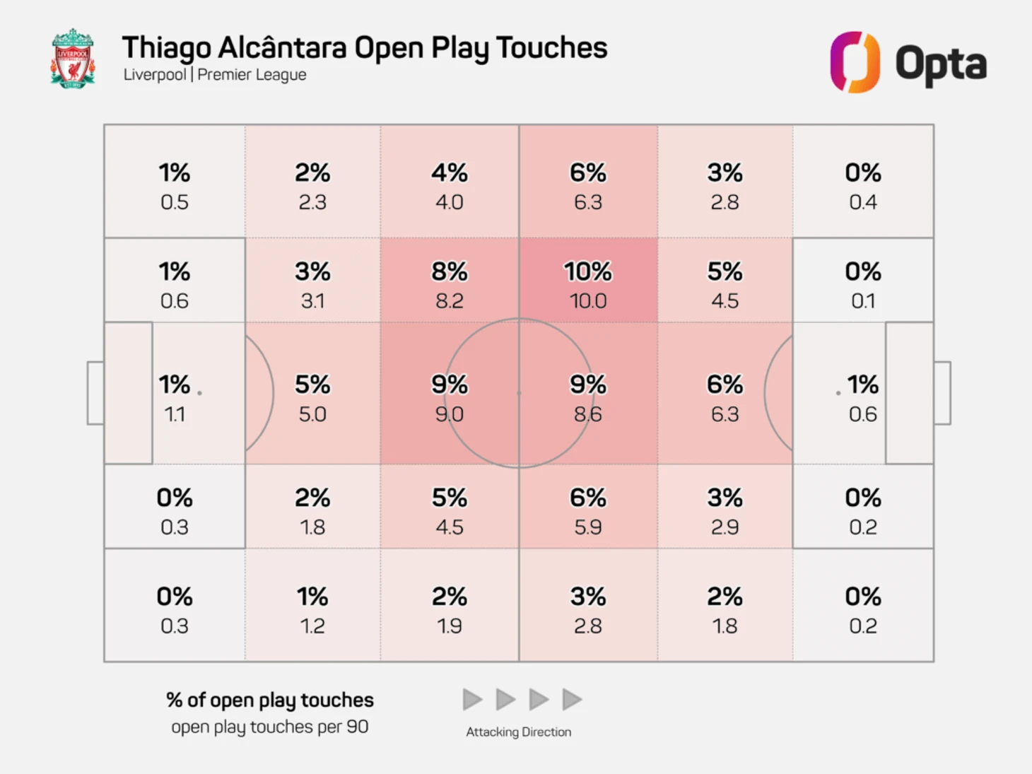 Во время своей карьеры в «Ливерпуле» Тиаго преимущественно действовал на левом фланге полузащиты, и обязанности правой «десятки», требующие частого дрейфа, похоже, не подходят для его игры, основанной на дергании за ниточки из центральных зон, как подчеркивается на этом графике, показывающем его игровые касания с игры в Премьер-лиге.