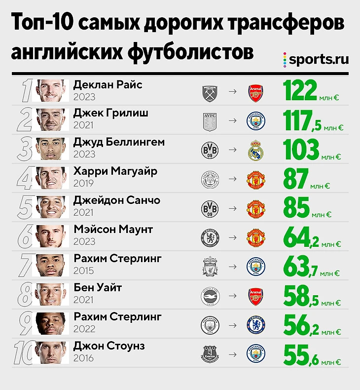 • Летом 2023-го сразу три игрока вклинились в десятку – Райс, Беллингем и Маунт. Без них в рейтинге бы присутствовали Арон Уан-Биссака (55 млн), Кайл Уокер (52,7 млн) и Бен Чилуэлл (50,2 млн).