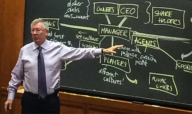 Связи Фергюсона с Гарвардом начались еще в 2012-м – он помогал профессору Аните Элберс, которая писала работу «Сэр Алекс Фергюсон в «Манчестер Юнайтед». С тех пор они с Элберс сотрудничали, и в октябре 2013-го в журнале Harvard Business Review вышла статья с анализом методов Фергюсона. В апреле 2014-го Гарвардская школа бизнеса объявила, что Фергюсон прочитает 6-недельный курс лекций для тех, кто учится на руководителей. Стоимость – 60 тысяч фунтов.