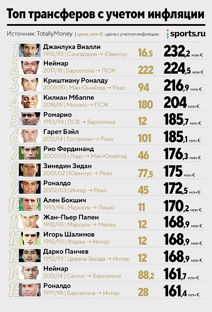 Сравнивать суммы трансферов в разные эпохи без учета инфляции некорректно – да, в футболе она тоже есть. В 2019-м понятие разобрал Вадим Лукомский. Вот краткие тезисы:
