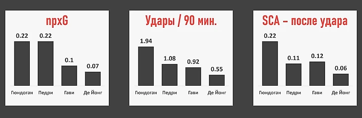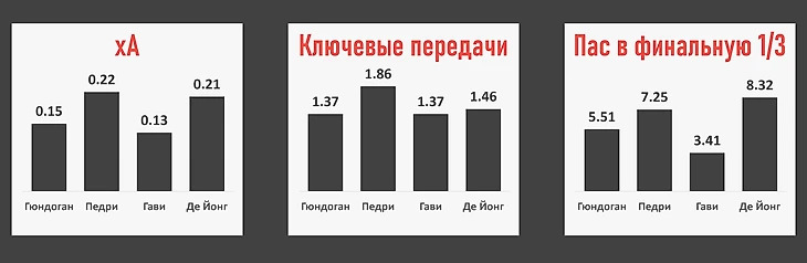 Многие спекулируют на тему того, что места в составе лишится Гави - самый молодой полузащитник из нынешнего состава, но невероятно талантливый. Ведь брать фигуру уровня Гюндогана на роль игрока ротации - глупо. Последнее верно, и в зависимости от соперника можно давать отдых разным исполнителям, однако и Де Йонг, и Гави обладают уникальными качествами, превосходящими аналогичные умения новичка. Голландец превосходно продвигается вперед с мячом (преодолевает таким образом в 2,1 раза большую дистанцию, недели Гюндоган), а испанский вундеркинд - прессинг-машина с огромным количеством единоборств, совершенных (х3,2) и заработанных (х2,3) фолов.