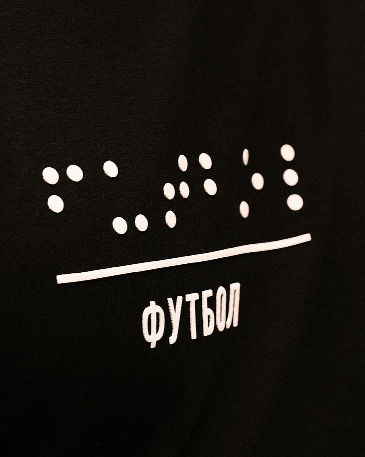 Принт минималистичный, в нем только два слова, и оба – «Футбол», но одно написано кириллицей, а другое языком Брайля. Мы сделали принт при помощи технологии High density, которая дает тот самый 3D эффект, позволяющий считать текст незрячим ребятам при помощи кончиков пальцев.