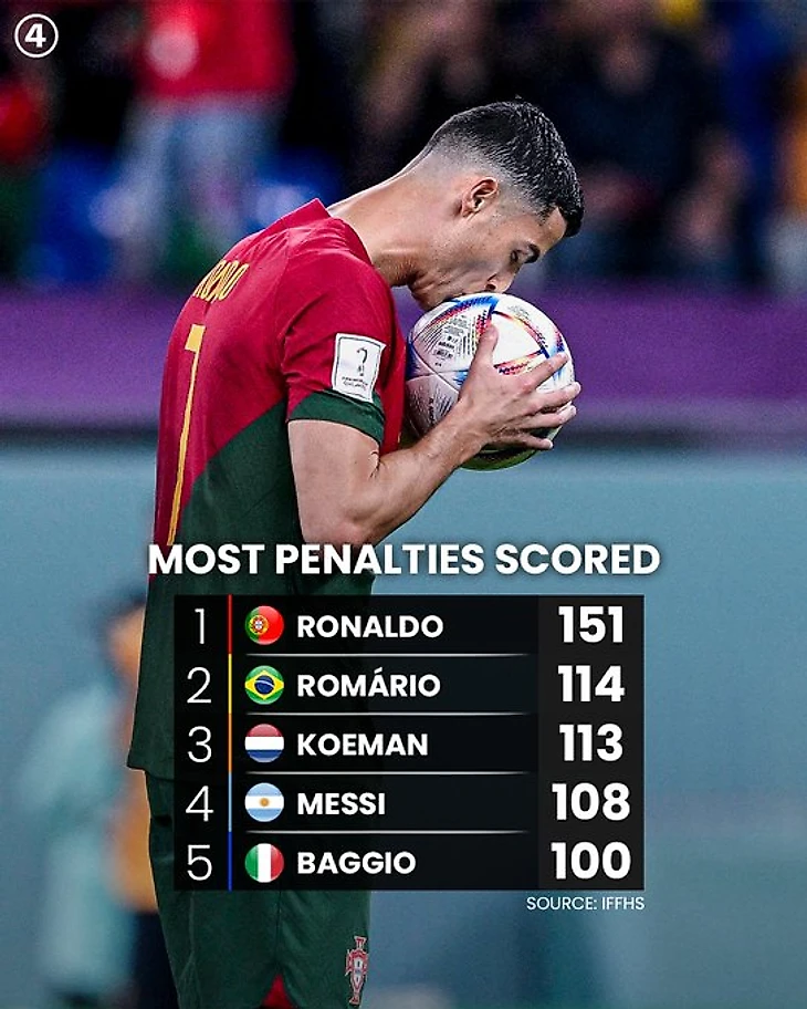 Международная федерация футбольной статистики и истории (IFFHS) подсчитала количество реализованных за карьеру пенальти как в клубной, так и в международной карьере. Первое место без шансов для остальных занял португальский форвард «Аль-Насра» Криштиану Роналду.