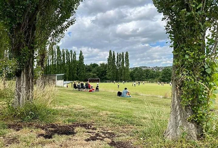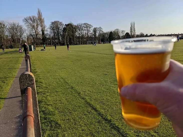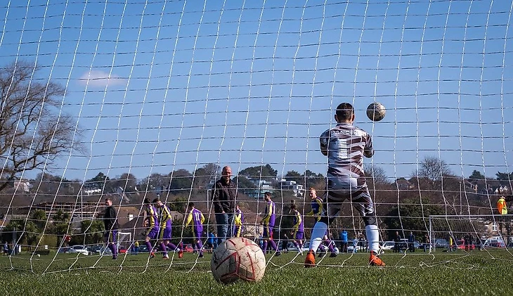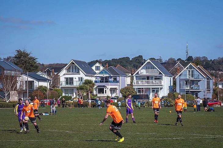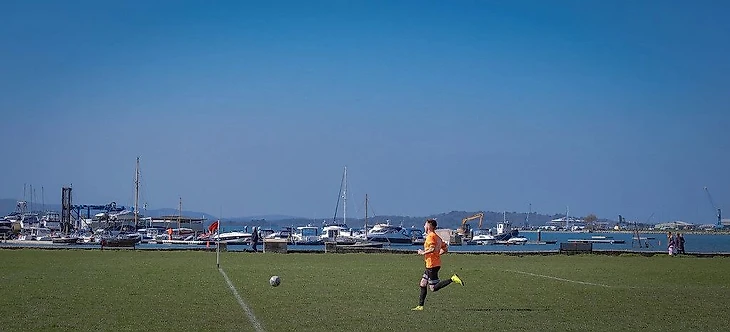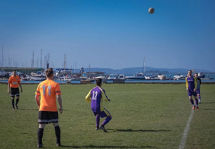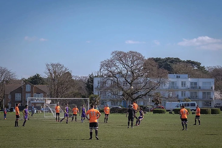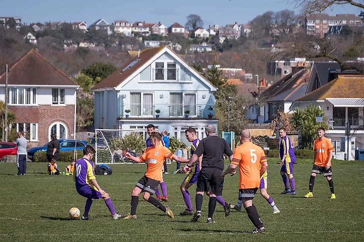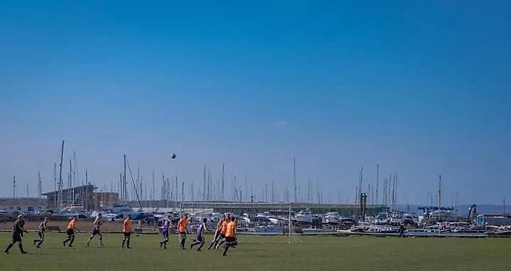 Футбольное поле «Уайтклифф Харборсайд Парк» в метрах от яхт-клуба и курортных домиков, воскресная лига Борнмута.