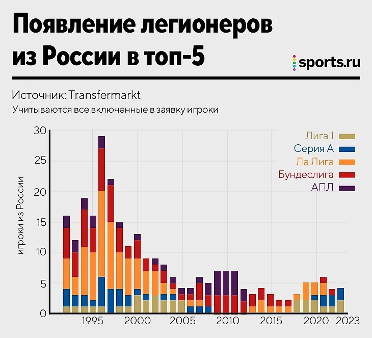 • Самый непопулярный маршрут среди топ-5 лиг для наших футболистов – АПЛ. Там россиян не было с сезона-2012/13 – уже больше десяти лет.