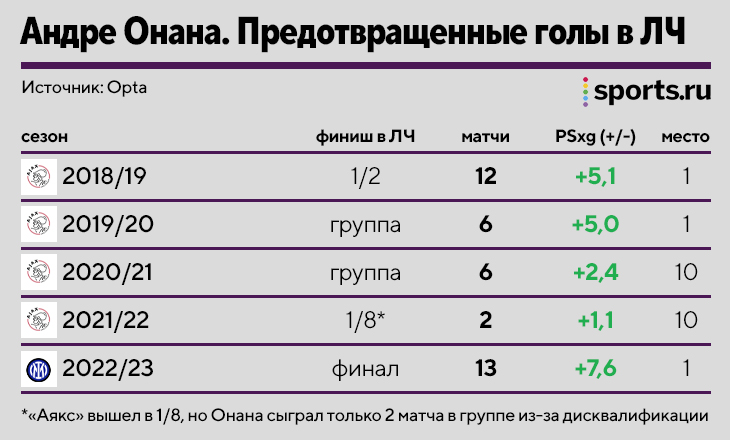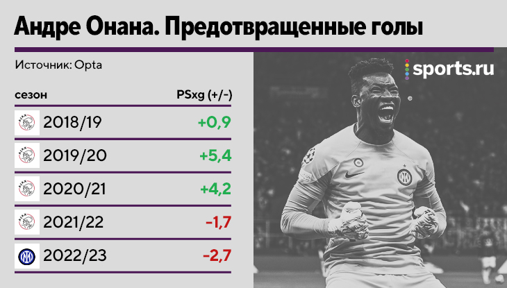 Ощутимая просадка случилась в Серии А – Онана пропустил почти на три гола больше ожидаемого. Спад стартовал в «Аяксе», но в сезоне-2021/22 Андре отыграл всего 10 матчей в Эредивизи, прежде чем получил 9-месячный бан. Нельзя утверждать, что он ухудшил бы (или улучшил) показатель, если бы отыграл сезон полностью.