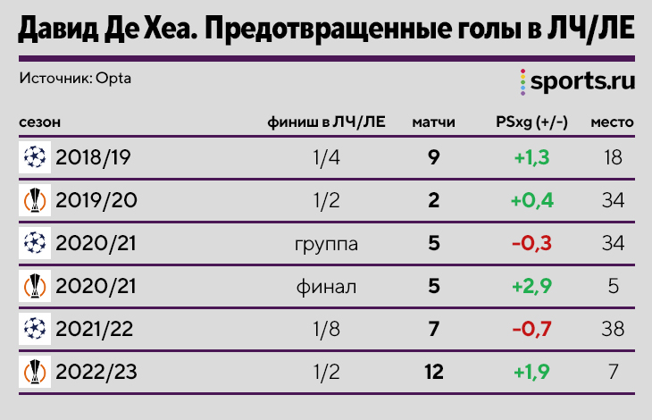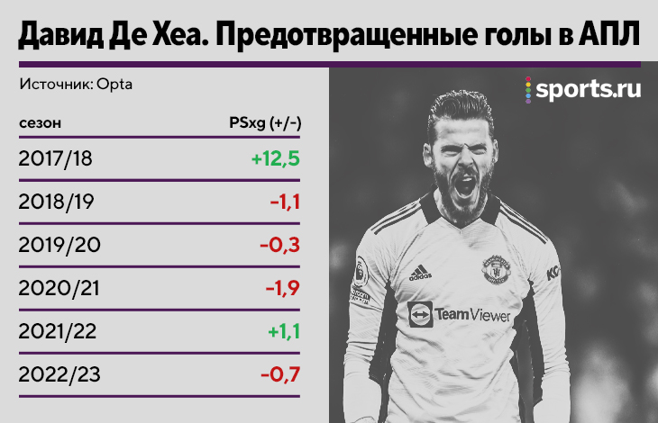 Для начала нужно зафиксировать – репутация элитного шотстоппера Де Хеа прилично переоценена. У Opta есть данные по предотвращенным голам за последние шесть сезонов – подсчет ведется как раз с пикового для Давида сезона-2017/18. Для оценки используется метрика PSxg (+/-) – Post-shot expected goals.