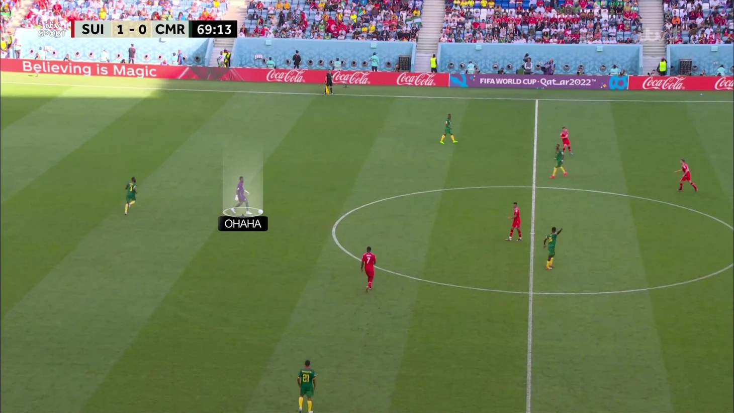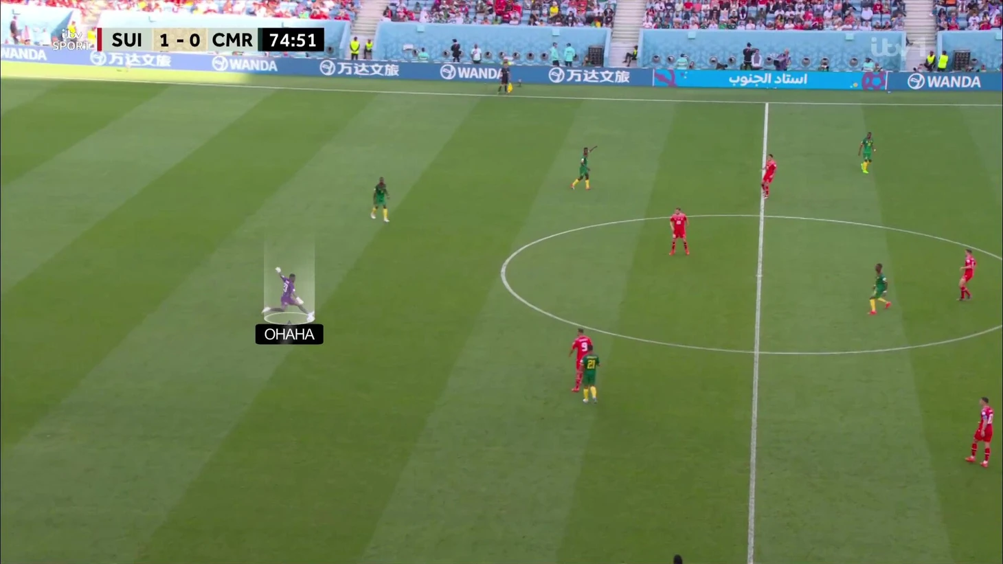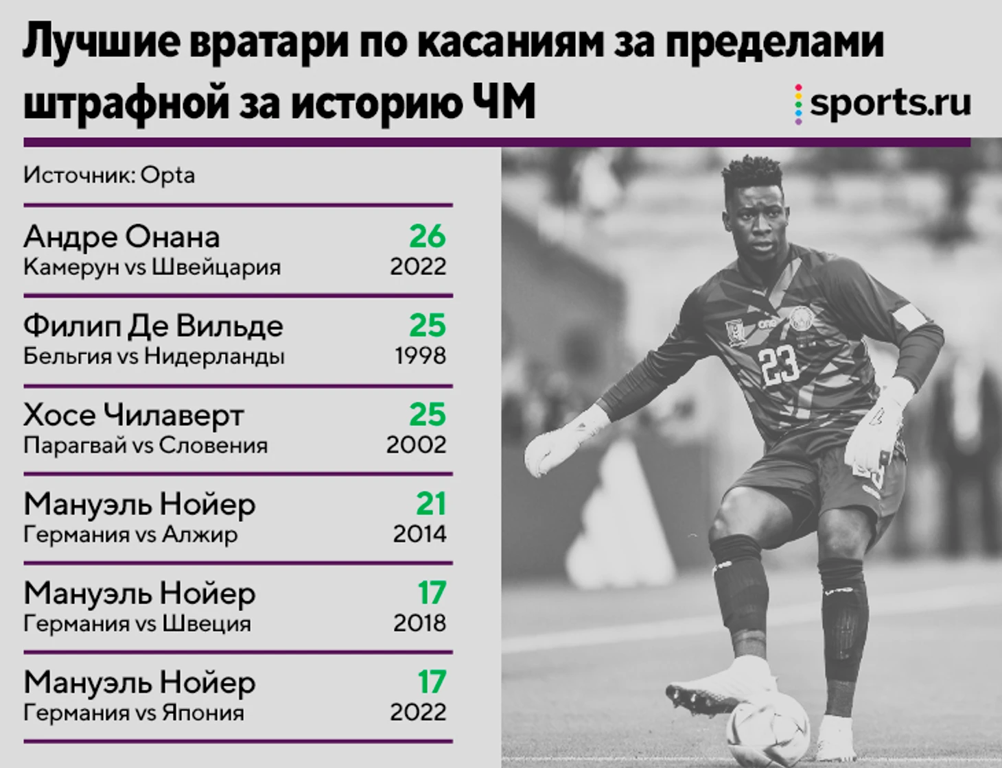 Похожий расклад был и на ЧМ-2022 – правда, там высокая позиция Онана была обусловлена низким качеством первого паса у центральных защитников Камеруна. Вот короткое объяснение Вадима Лукомского: «Онана просто взял на себя часть их функций, что приводило к моментам, где Андре поднимается выше последнего защитника (или на одну линию), чтобы начать атаку: