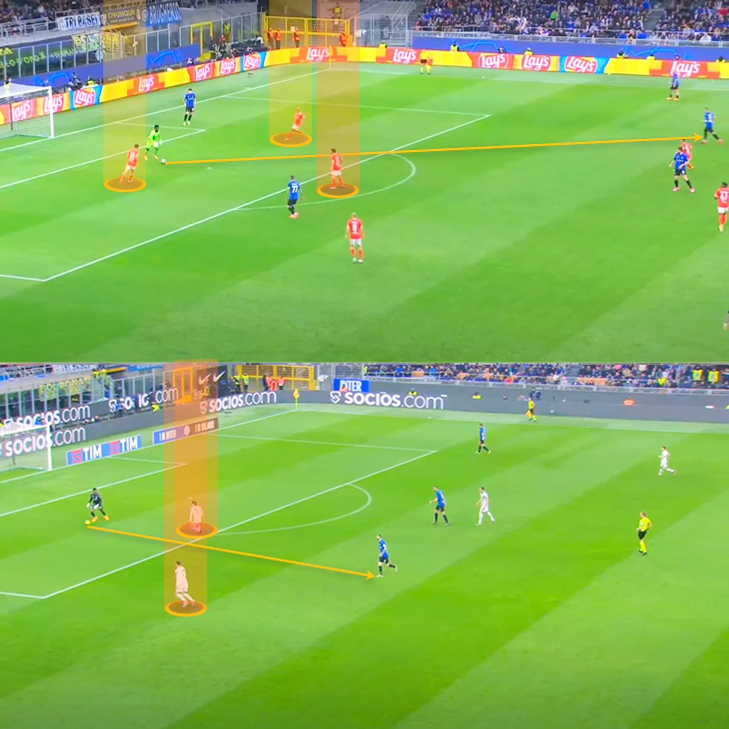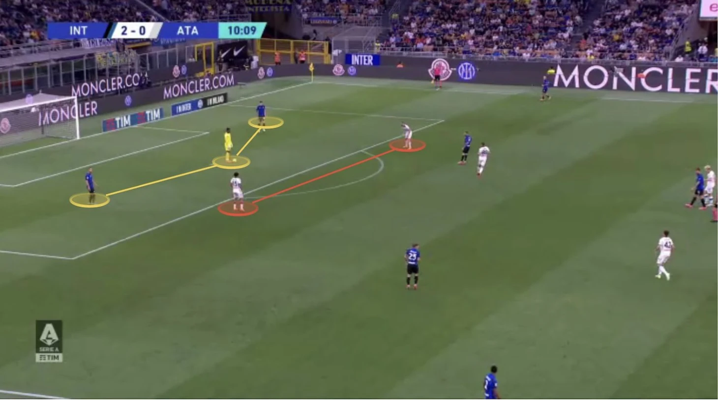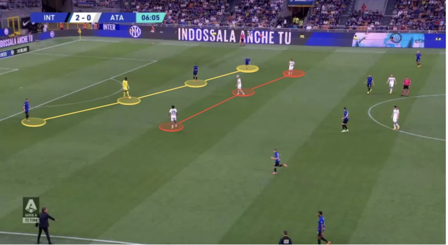 Пример из игры с «Аталантой»: Андре поднимается на одну линию с центральными защитниками и создает ситуацию 4 в 3 при выходе из обороны.