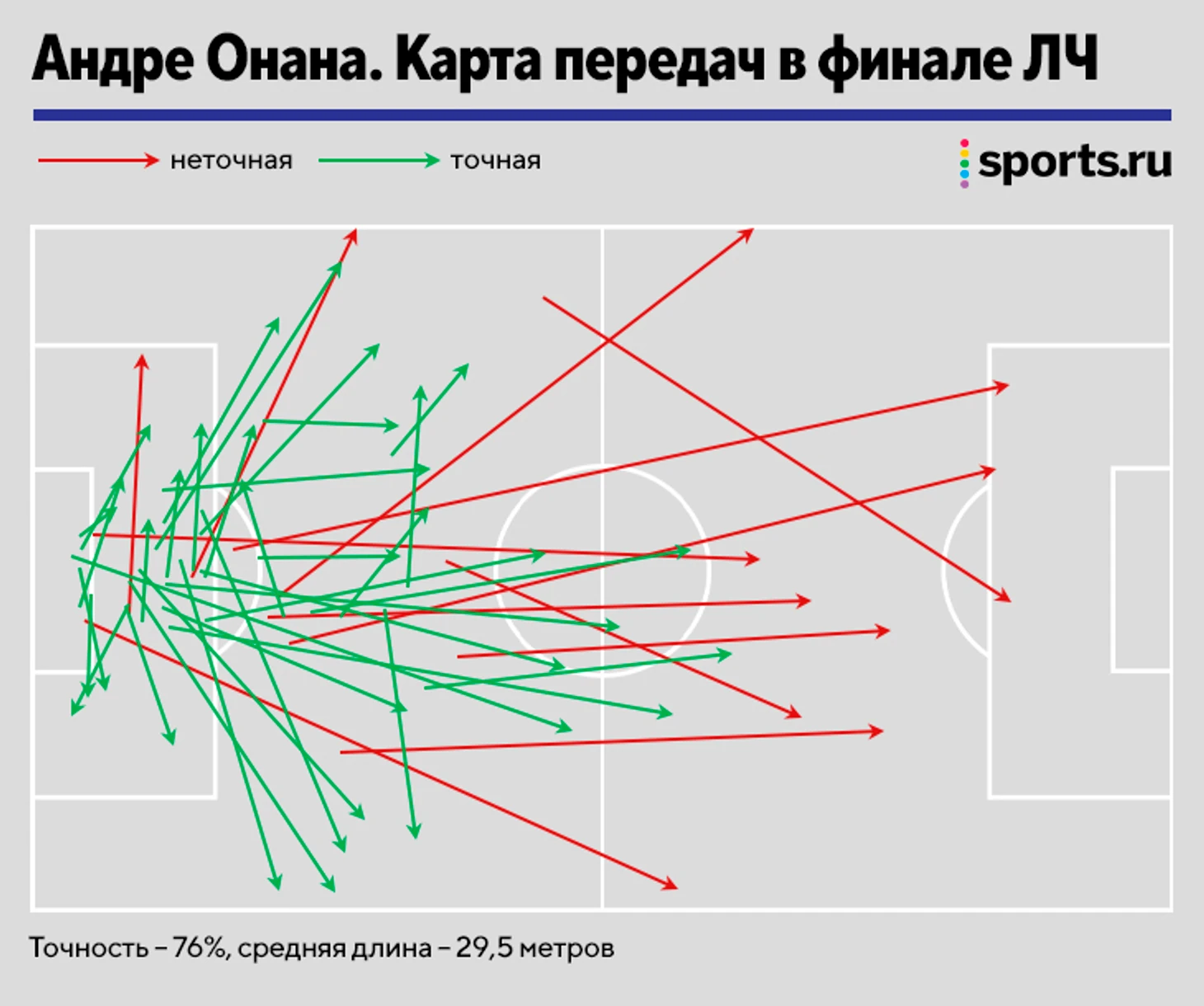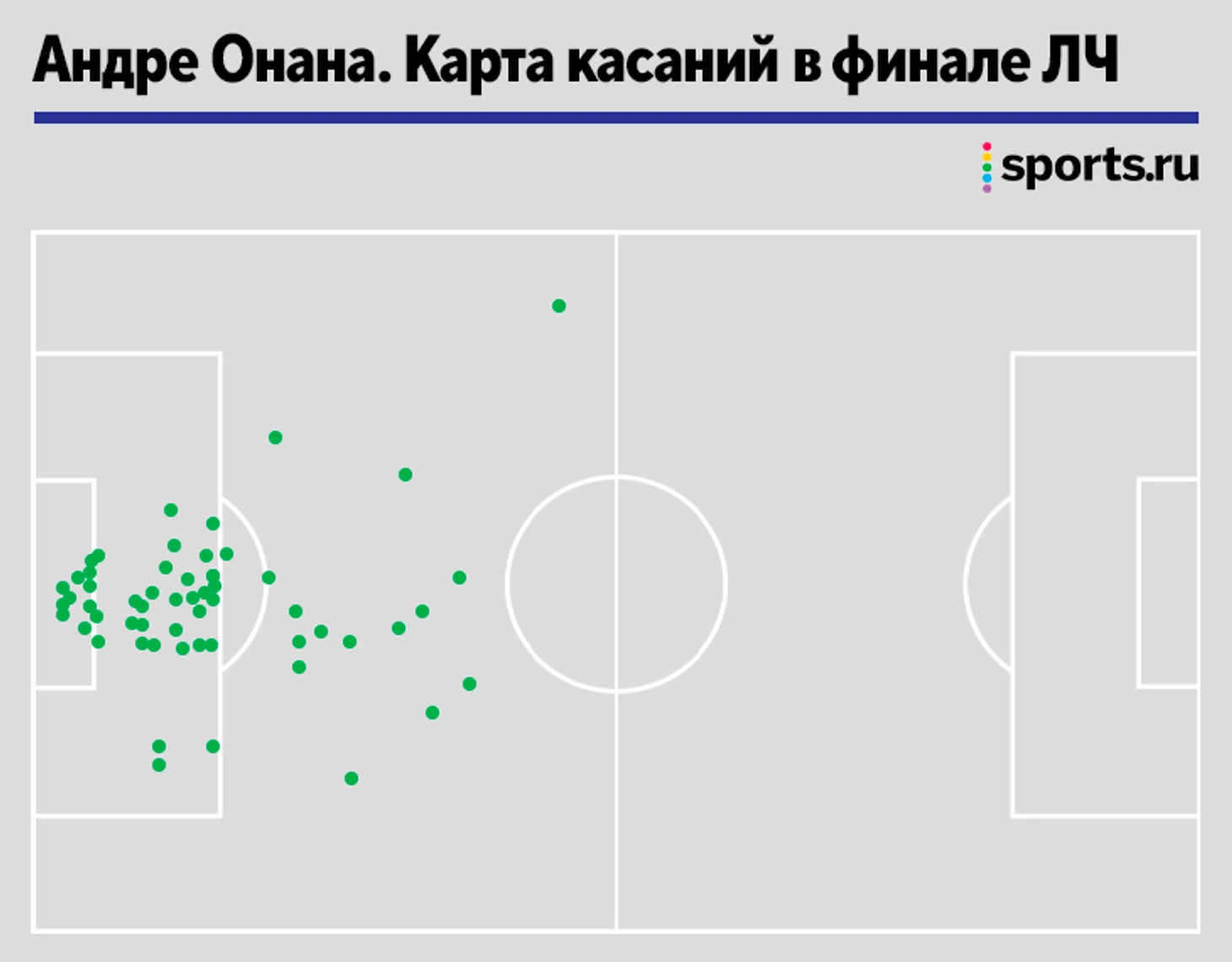 Гвардиола восторгался умениями Онана перед финалом ЛЧ: «У «Интера» выстроенная игра – начиная с Андре Онана, выдающегося голкипера с точки зрения начала атаки, одного из лучших в мире. Из-за этого их становится сложнее высоко прессинговать» Онана не подвел и устроил шоу: cмотрим на карту касаний (16 за пределами штрафной!) и карту передач (76% точности при средней длине в почти 30 метров).