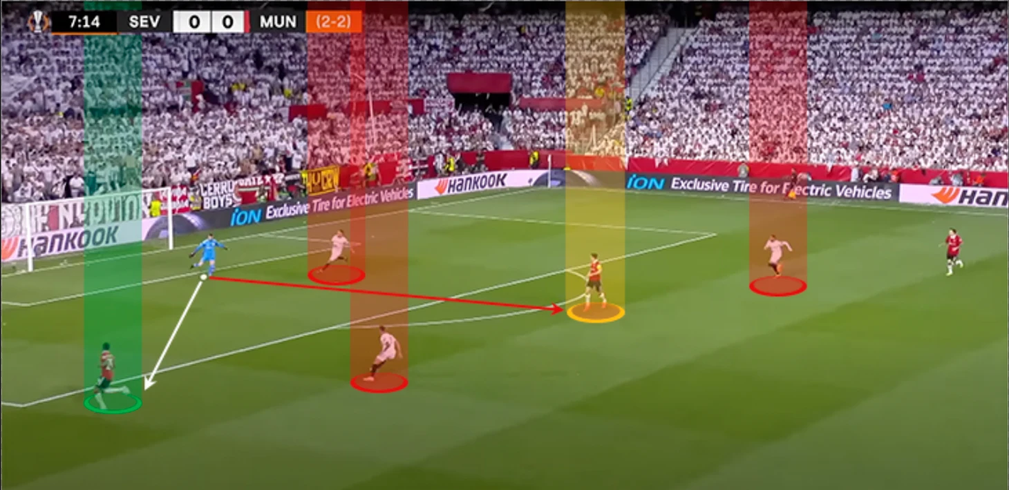 Ответный матч с «Севильей» в 1/2 ЛЕ, 8-я минута. Де Хеа вновь выбирает самый опасный вариант передачи (на Магуайра могут выдвинуться сразу три игрока «Севильи») и отсекает вариант с пасом на Уан-Биссаку. Худший прогноз сбывается через секунду – Харри делает передачу в Ламелу, а от него мяч быстро доходит Эн-Несери. 1:0.