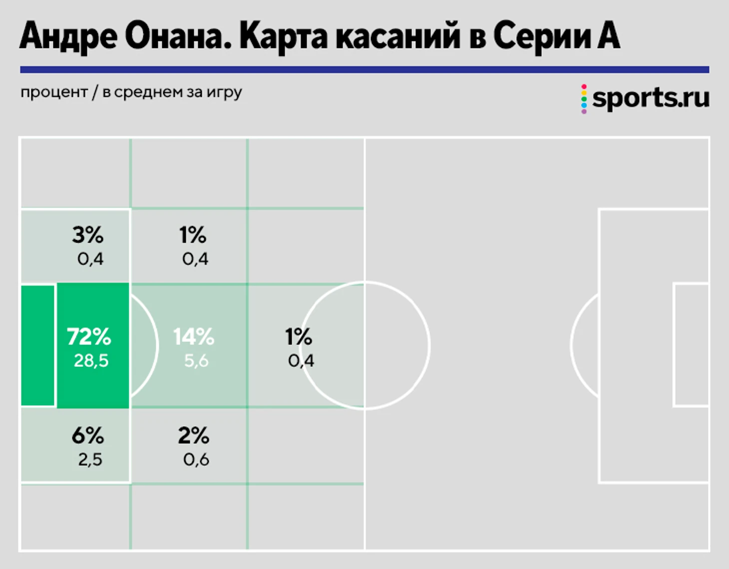 В этих моментах не было специальных расхождений центрдефов под создание позиции для вратаря и численного преимущества (или других хитрых приемов). Пасовать из этих точек могли бы сами защитники (при более классической позиции Онана) – просто они хуже в этом». Кстати, из-за конфликта с тренером Ригобером Сонгом Андре Онана прямо по ходу турнира был выведен из состава. Немного деталей от Фабрицио Романо: футболист и тренер не сошлись в видении тактики. Онана сказал, что идеи тренера далеки от его понимания футбола. *** Карта касаний Онана в Серии А хорошо иллюстрирует стиль голкипера – он контролирует как штрафную, так и пространство перед ней. За счет высокой позиции Андре центральные защитники «Интера» сильнее продвигаются вперед.