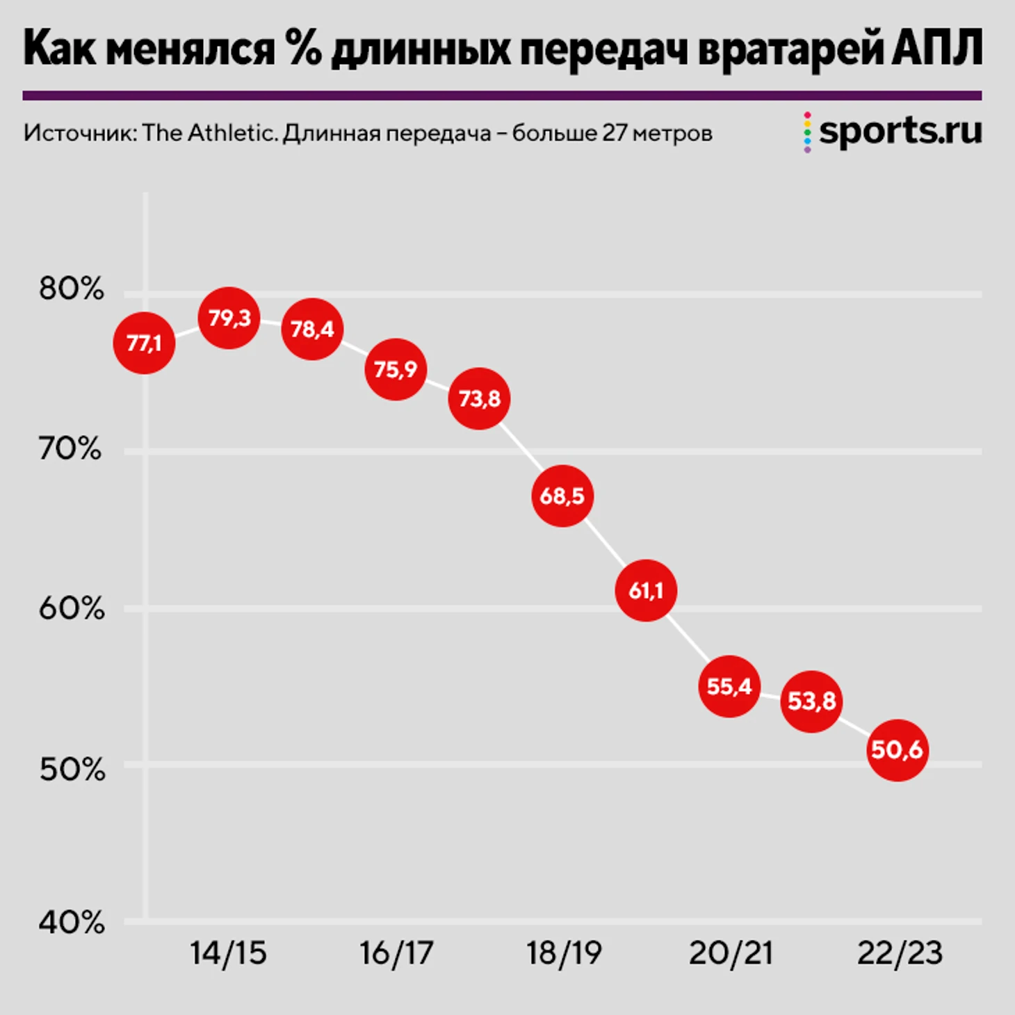 Стил подытожил – проблема не во вратарях: «Если у вас нет футболистов, способных играть в пас… Может, при всем уважении, дело в том, что в первые два года [игры Де Хеа в «МЮ»] состав «Юнайтед» был лучше, чем сейчас?» Ворчание фанатов старой школы объяснимо, но тренеры и скауты клубов АПЛ не могут игнорировать очевидную тенденцию. За последние 10 лет стиль передач вратарей изменился. Голкиперы перестали бесцельно выбивать мяч на чужую половину поля – передачи стали короче и осмысленнее.