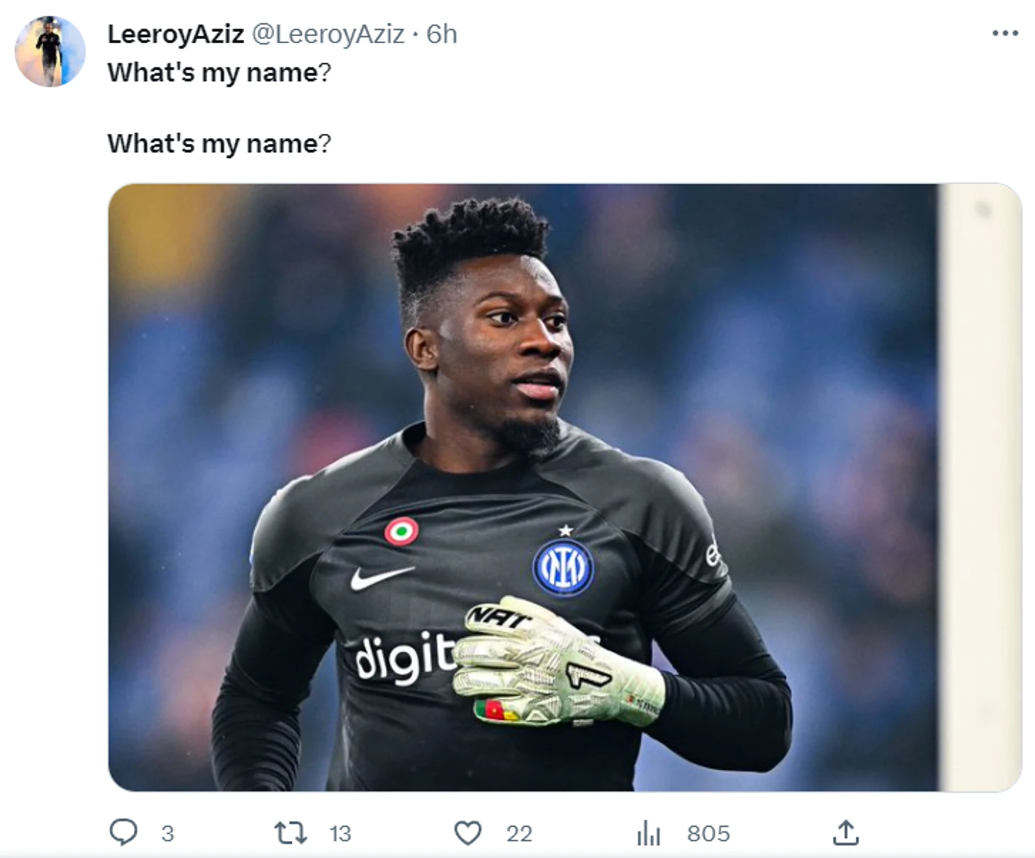Но в Манчестере не первыми до этого додумались. Еще «Интер», подписывая Онана, писал в твиттере «What’s My Name?» – и все понимали, о каком это футболисте. За последние пару лет нарезки сэйвов или ляпов Онана под Рианну – очевидное художественное решение. Как и альтернативная добивка припева: «Онана! Что за сэйв!».