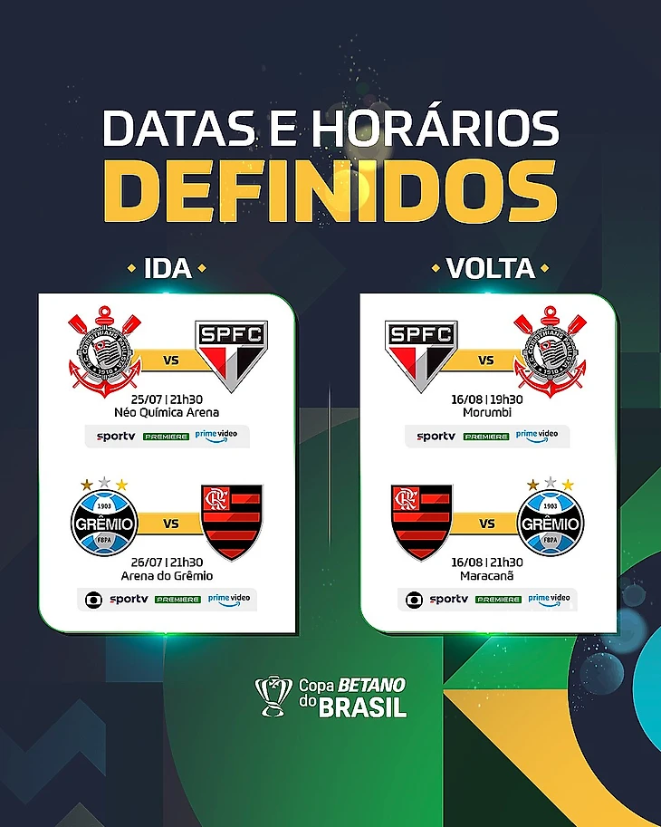 Итак пары «Коринтианс»-»Сан-Паулу» и «Фламенго»-»Гремио». Первые матчи пройдут 26 июля, ответные 16 августа.