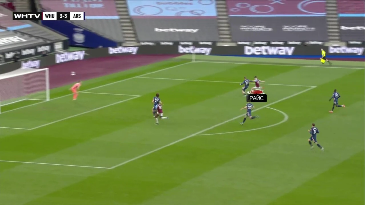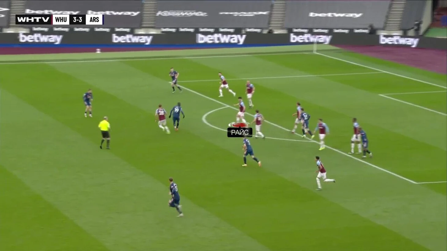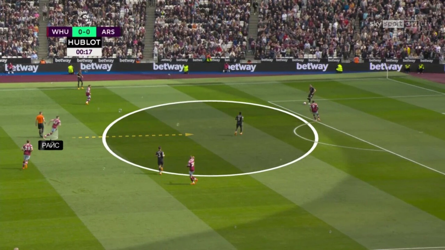 Еще одно достоинство Райса в такие моменты – крайне высокая для опорника скорость. О ней отлично осведомлен Томас Парти. Деклан регулярно накрывал ганца в последнем очном матче. Важный момент – расстояние между ними в момент передач на Парти. «Вест Хэм» не шел в тотальный прессинг, Райс не располагался рядом с оппонентом сразу, а стартовал из глубины: