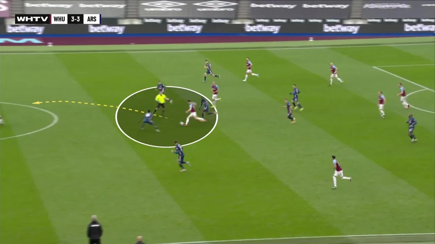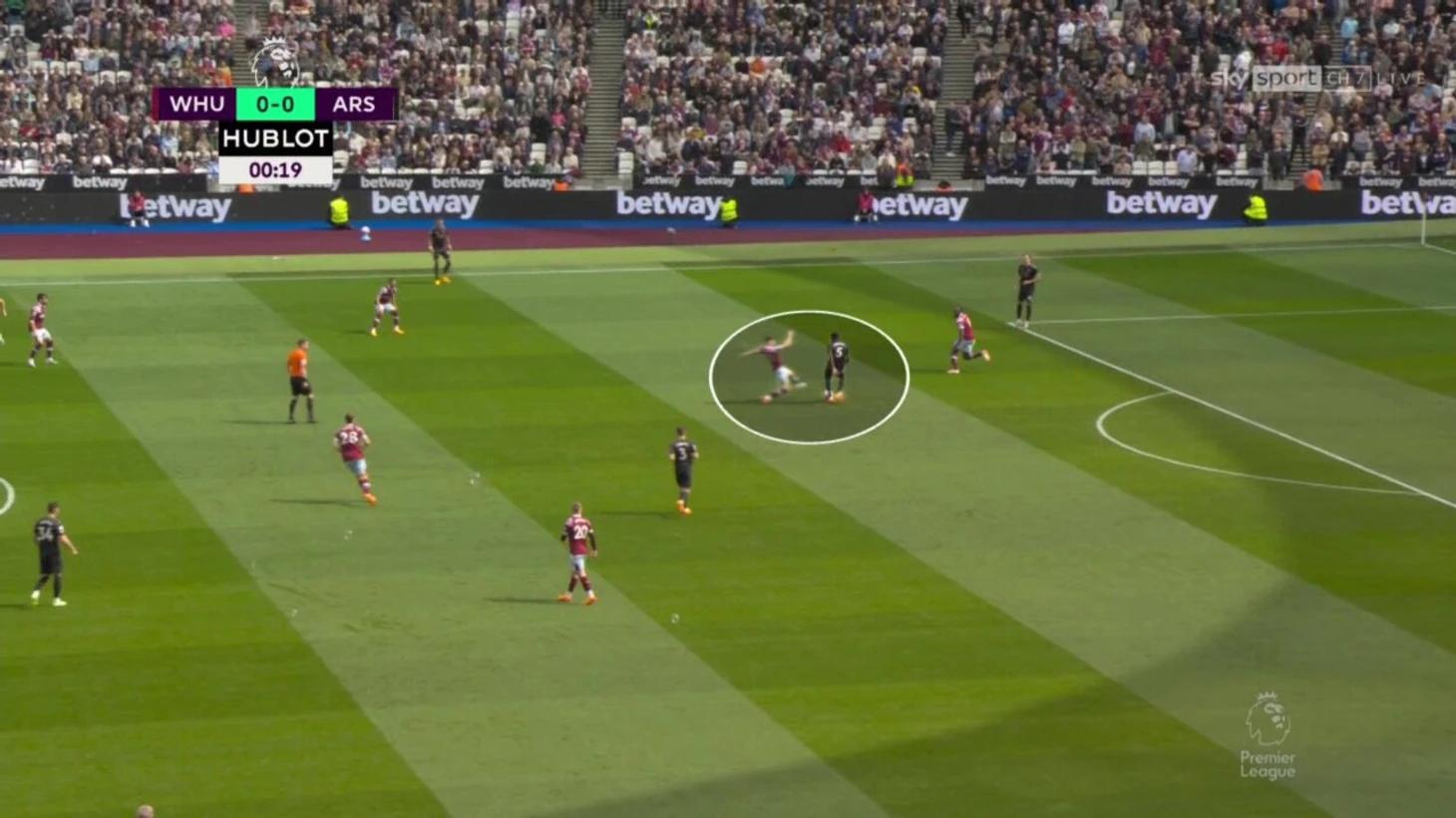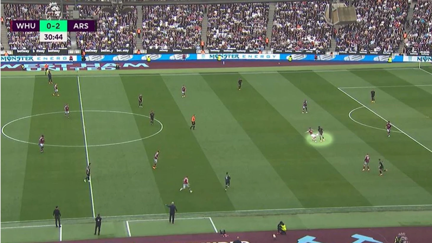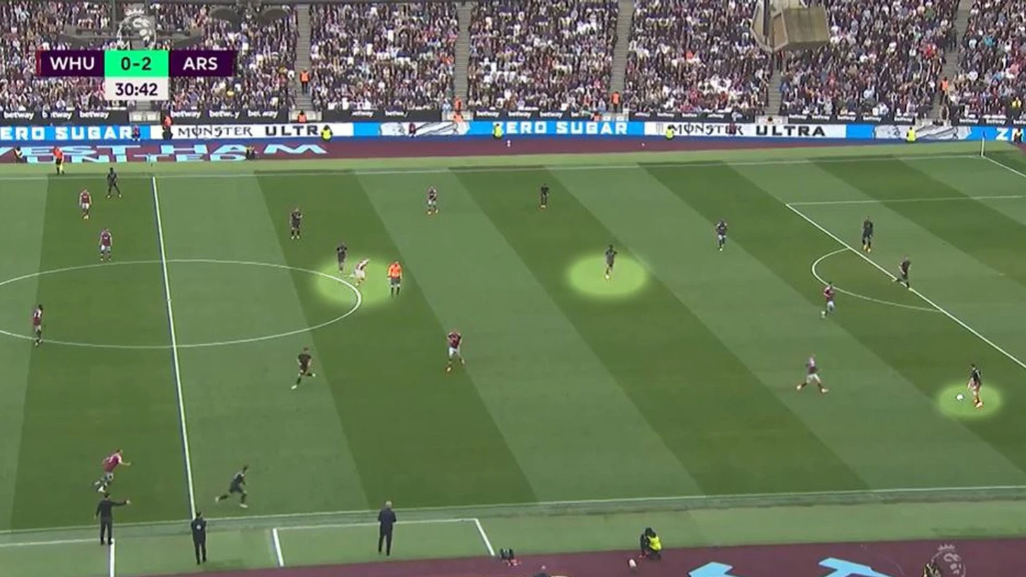 Еще одно достоинство Райса в такие моменты – крайне высокая для опорника скорость. О ней отлично осведомлен Томас Парти. Деклан регулярно накрывал ганца в последнем очном матче. Важный момент – расстояние между ними в момент передач на Парти. «Вест Хэм» не шел в тотальный прессинг, Райс не располагался рядом с оппонентом сразу, а стартовал из глубины: