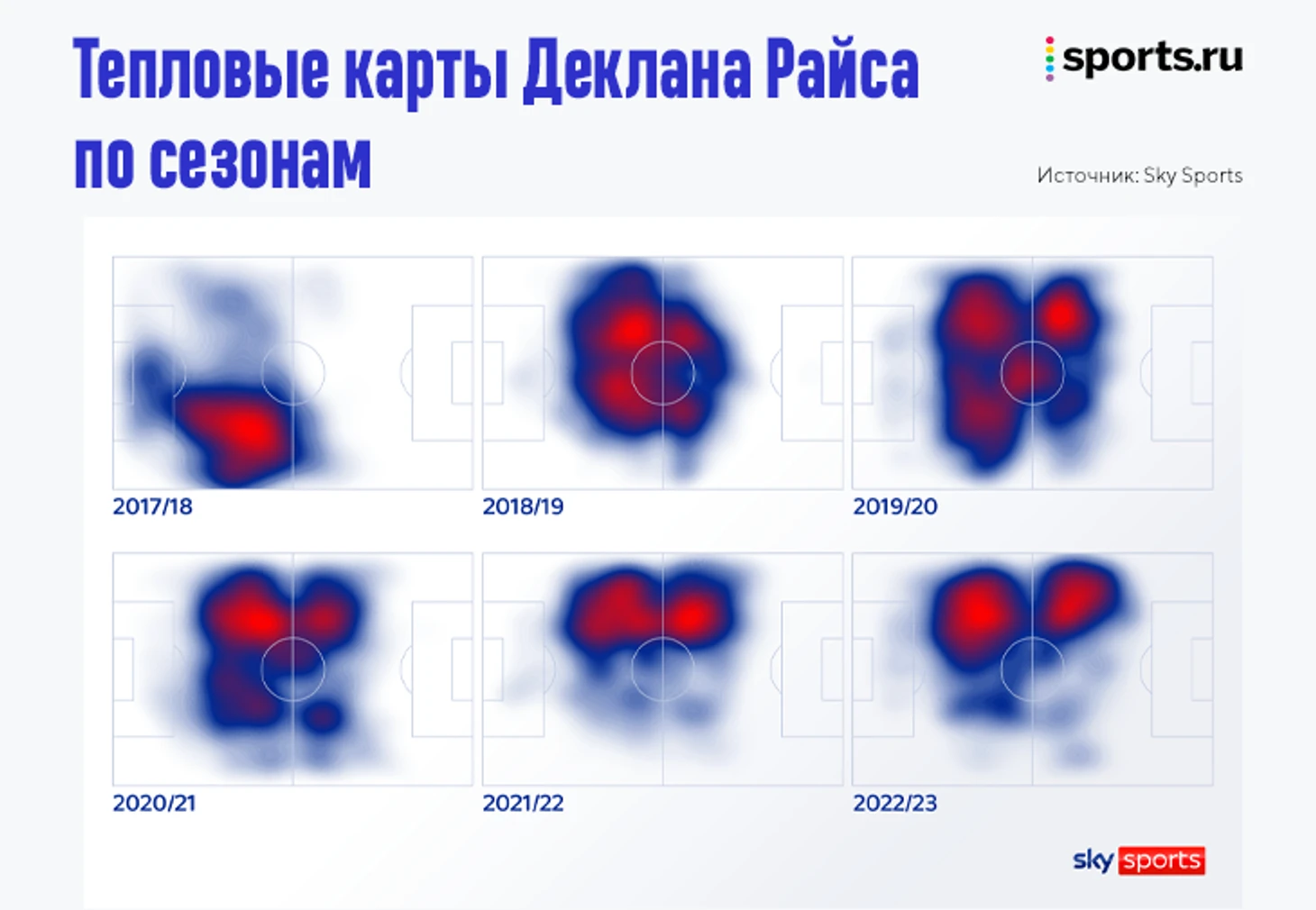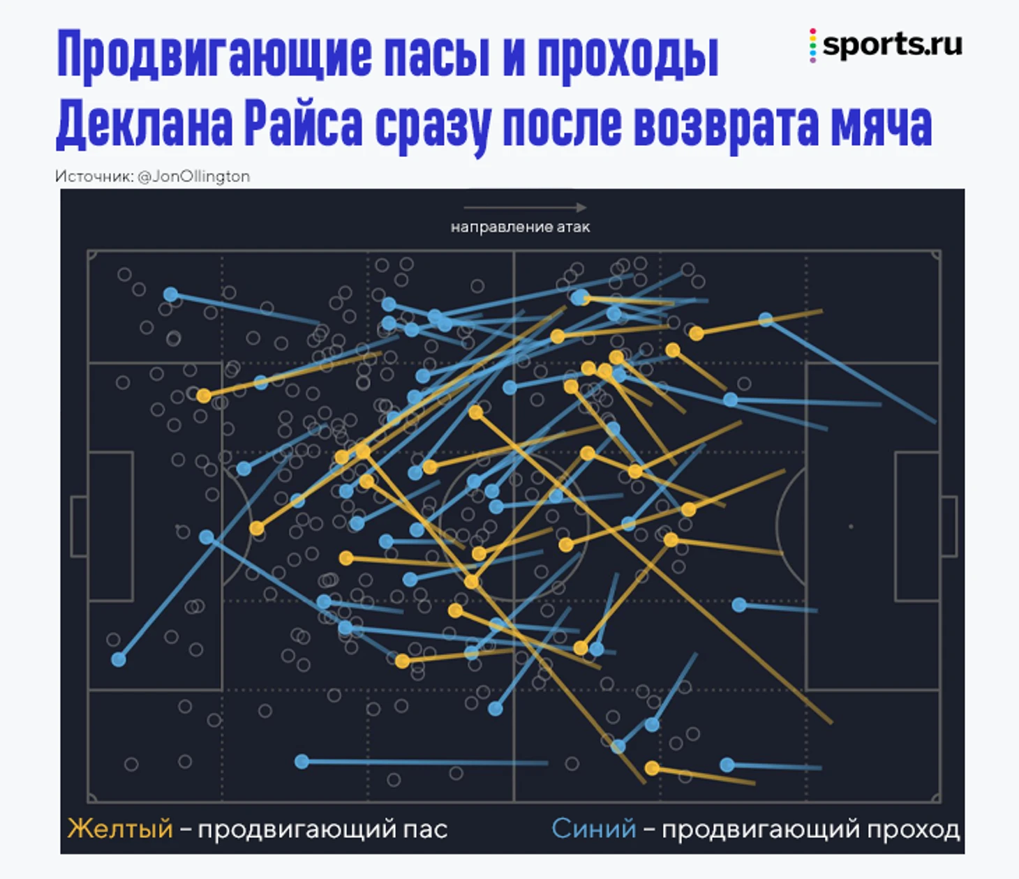 В сезоне-2021/22 Райс был лучшим среди всех полузащитников АПЛ по продвигающим проходам (рассчитанным по метрам на 90 минут). Показательно, что главными конкурентами были Бернарду Силва и Матео Ковачич – игроки совсем другого профиля. Качества в продвижении для Райса – бонусные, но они у него категорически прокачаны.