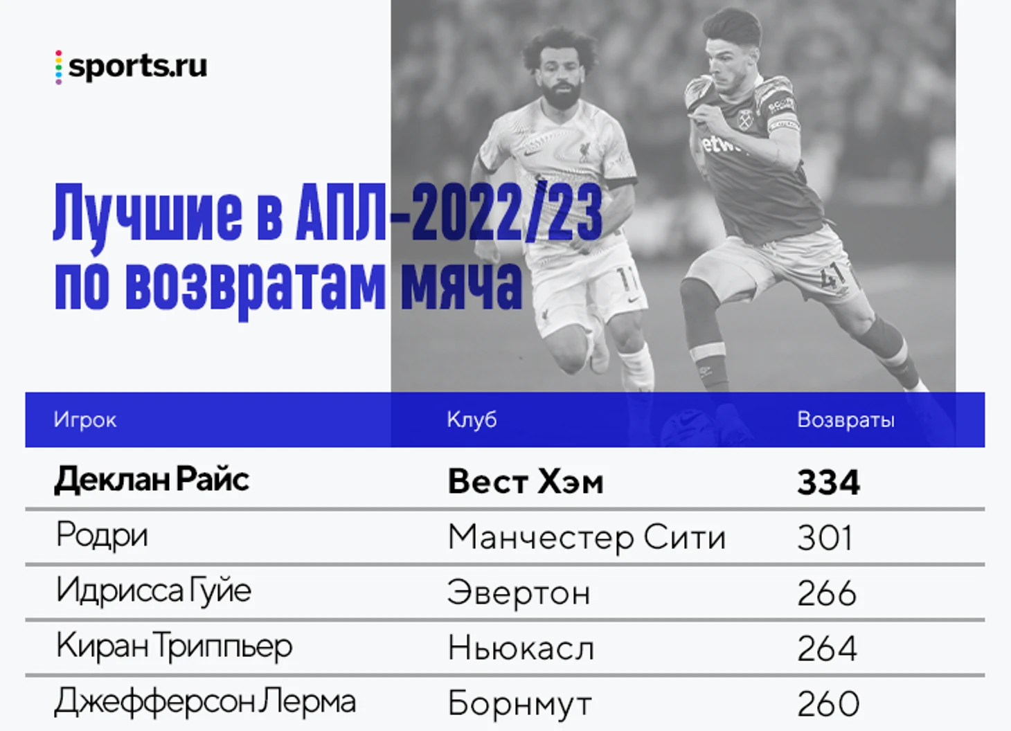 Деклан Райс чертовски хорошо возвращает команде мяч. Кроме объема действий (что частично связано со стилем команды, которая много времени проводит без мяча) он обладает высокой эффективностью и даже элегантностью. В прошлом сезоне Райс чаще всех в АПЛ возвращал мяч: