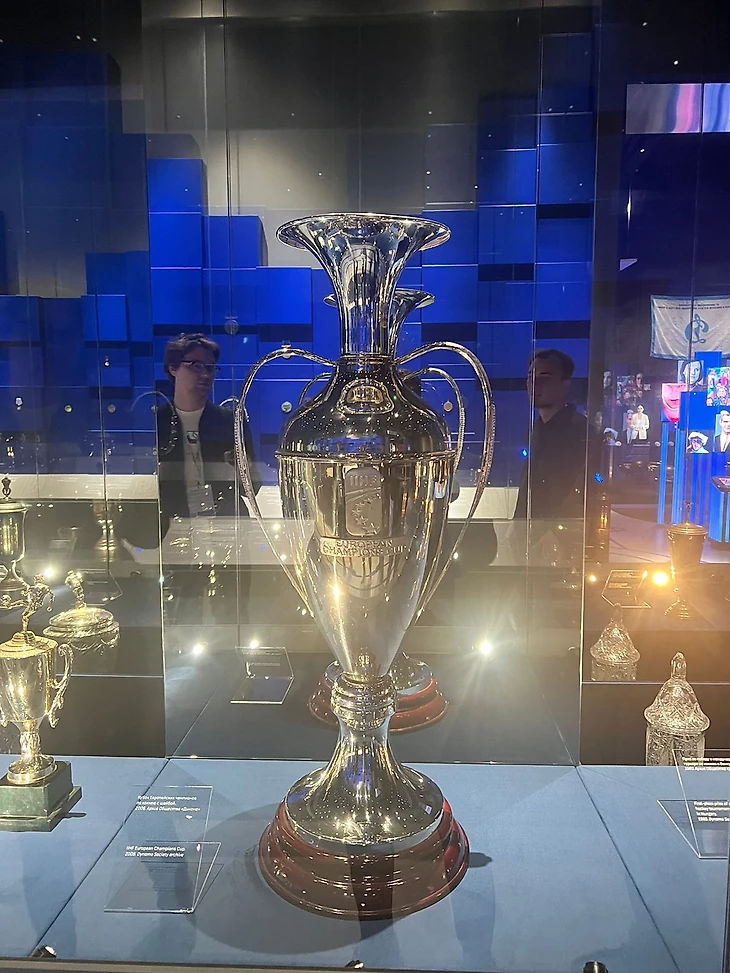 Затем отдельный зал с трофеями «Динамо» из разных видов спорта. Как вы понимаете, футбольные трофеи здесь в основном времен СССР, зато хоккейная полка довольно увесистая, в том числе благодаря громадному Кубку Европейских Чемпионов.