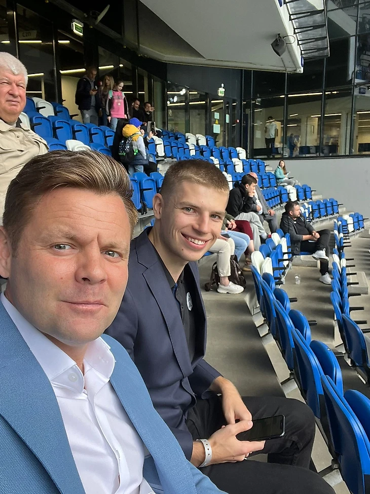 Однако, на удивление, всё прошло без всяких нареканий. Я всучил Крису талон электронной очереди, сразу прошел к окну, где уже через пять минут верификация была пройдена. Шеф всё равно ничего не понял, потому что формально это был не последний этап. На последнем шаге я скачал на его смартфон приложение FAN ID, авторизовался в нём через госуслуги (ведь в этом приложении, конечно же, есть только русскоязычная версия) и только после этого он получил свой сгенерированный номер карты, который мы тут же отправили коллегам для получения билетов на сегодняшние матчи. Только на этом этапе я успокоился:самую сложнейшую часть поездки можно было посчитать выполненной. А насколько доволен был Крис - можно увидеть на этом историческом фото