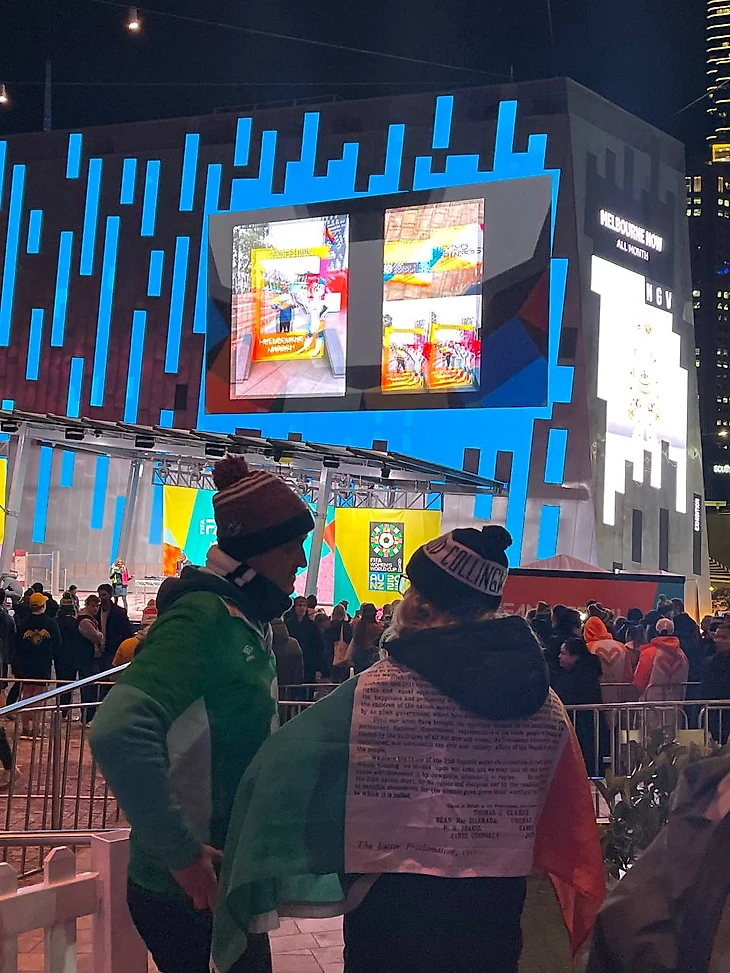Мы были полностью готовы к скверной мельбурнской погоде, поэтому после дневной прогулки и встречи с подругой, живущей в Мельбурне, надели теплые куртки и отправились в фан-зону смотреть стартовый матч сборной Австралии против Ирландии.